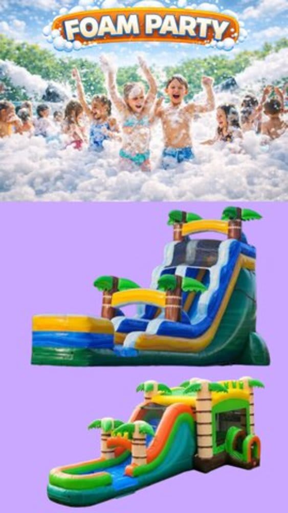 Turn up the fun and cool things down with our ultimate summer crowd-pleaser! This package includes a nonstop pile of Foam where guests can dance, play, and cool off in mountains of foam. Plus, keep the excitement going with an 18-foot water slide and an XL Bounce House Wet Slide combo—perfect for kids, teens, and festival-goers of all ages.