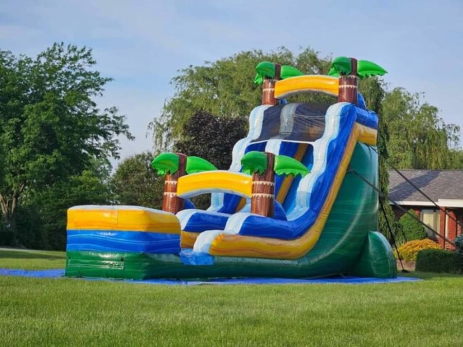 Introducing our stunning 18' Tropical Green Marble Wet / Dry Water Slide that stretches out 35'. This is a perfect addition to any event or party. This vibrant slide boasts a striking green marble design that captures the essence of a tropical paradise. Whether you're hosting a summer bash, birthday celebration, or community event, this slide promises endless fun and excitement for guests of all ages.Designed for versatility, the slide can be used both wet and dry, making it ideal for any weather condition or preference. On hot days, connect a hose to transform it into a refreshing water slide, complete with a splash pool at the bottom. For cooler days, enjoy the thrill of a dry slide experience.