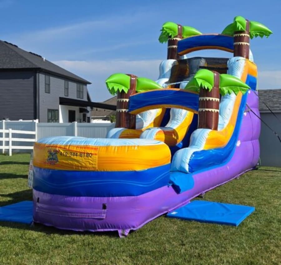 Introducing the 15' Tropical Purple Marble Slide, a versatile and exciting addition to any event or party. This stunning slide features a vibrant purple marble design that brings a tropical flair to your gathering. Whether you're planning a summer bash or a birthday celebration, this slide is perfect for both wet and dry use, making it suitable for any weather condition. At 15 feet tall, it offers a thrilling ride for kids and adults alike, ensuring hours of fun and entertainment. With its sturdy construction and safety features, you can enjoy peace of mind while your guests have a blast. Make your event unforgettable with the 15' Tropical Purple Marble Slide. Rent it today and let the fun begin!