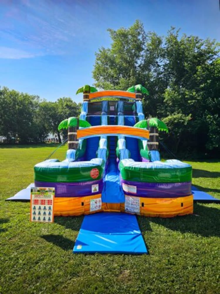 Perfect for birthday parties, community events, school functions, or any gathering where fun is a must, the 18' Dual-Lane Tropical Yellow Marble Wet / Dry Slide is sure to be a hit. Rent it today and create unforgettable memories for your guests!